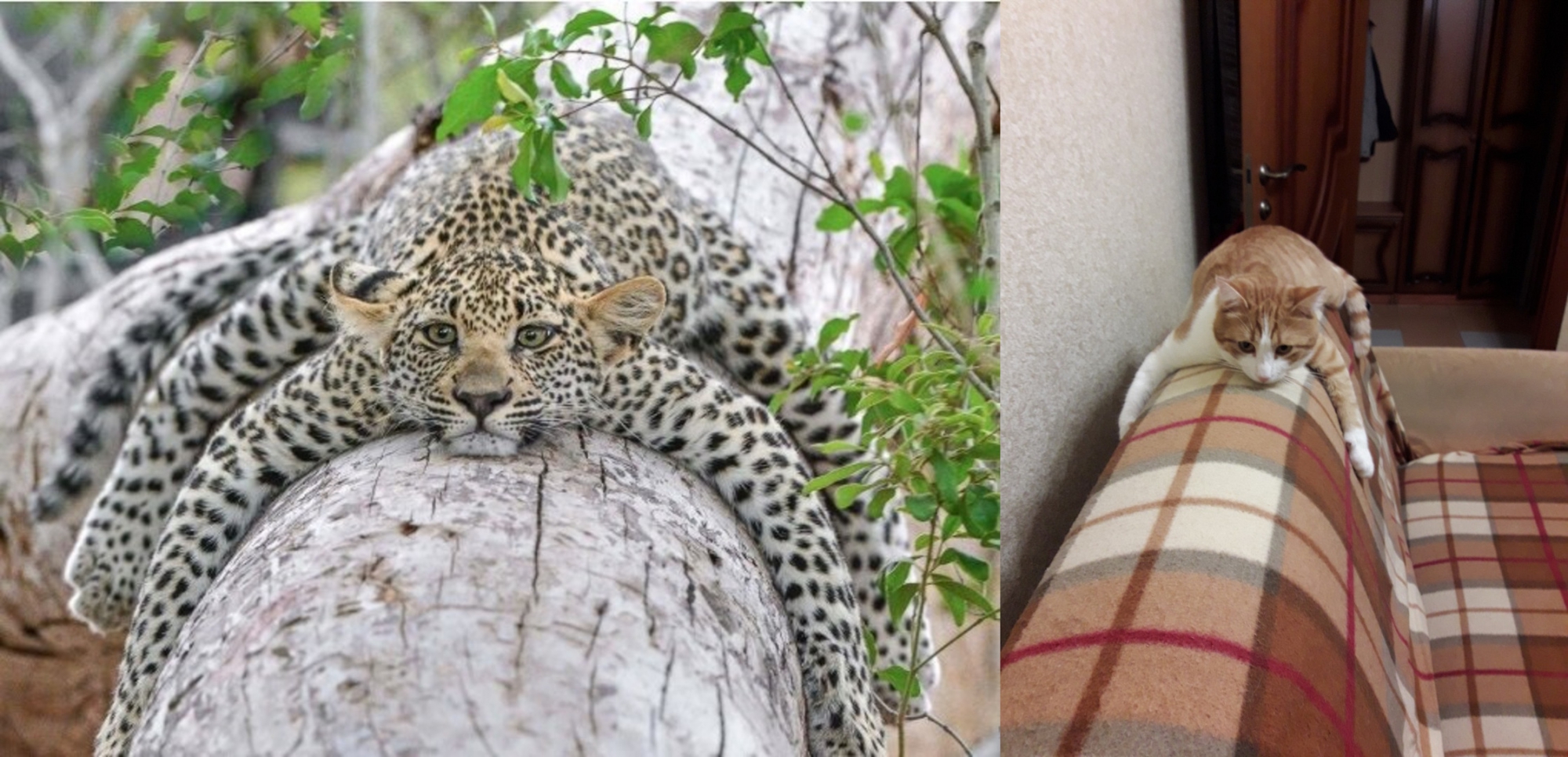 Я когда камент писал, там была фотка только леопарда. Теперь вижу гораздо больше отличий. Котик твой грустнее леопардыча почему-то. Срочно выдай ему кусок колбаски на 100-150 граммов!