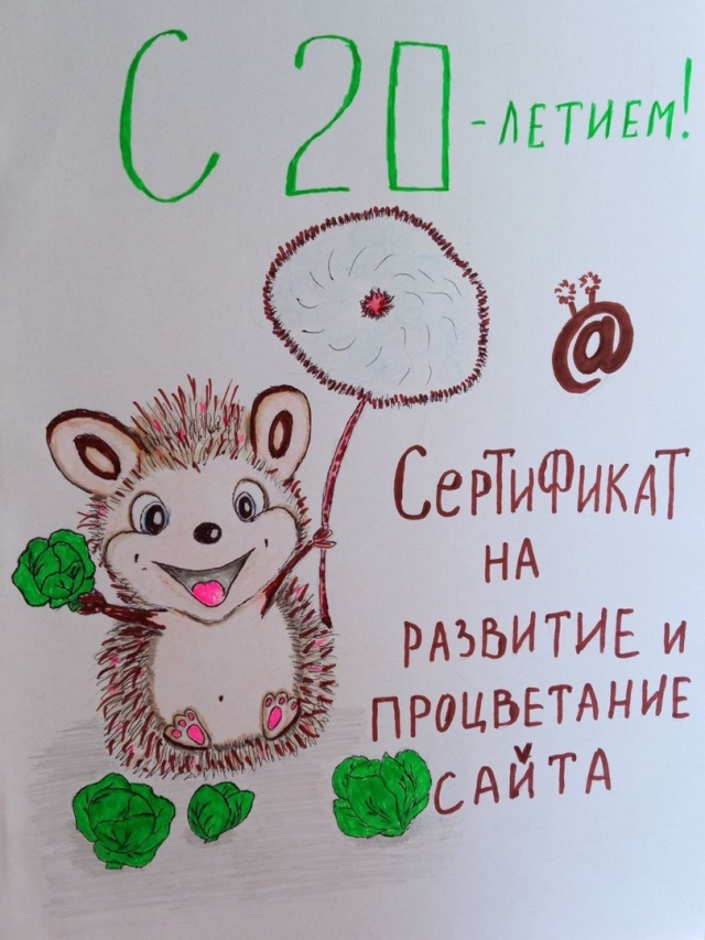 Давно полюбившийся всем нам сайт с праздником! По конкурсу немного досадно, что работа Vladimir32RUS далековато от лидеров. Хорошая работа с окосевшим котом и по теме праздника. Голосовал за ёжика. Мило и очень красиво нарисовано.