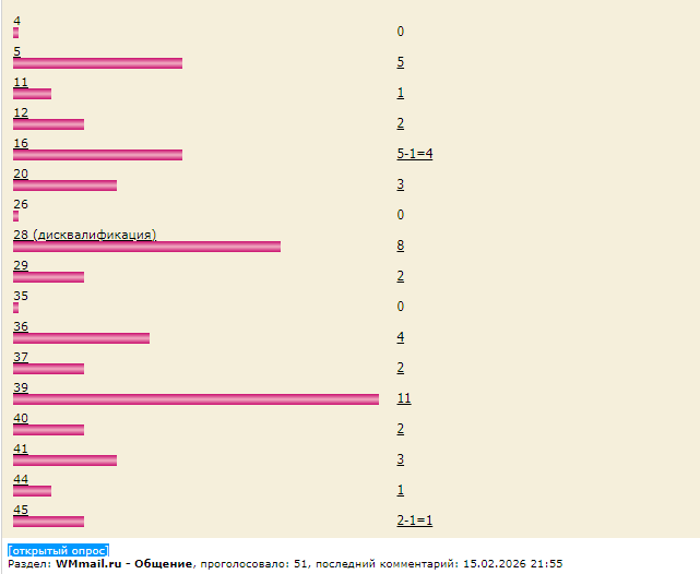 35) 15-1=14 (kerk: дата регистрации: 11.02.2026, участвовал в опросах: 1)